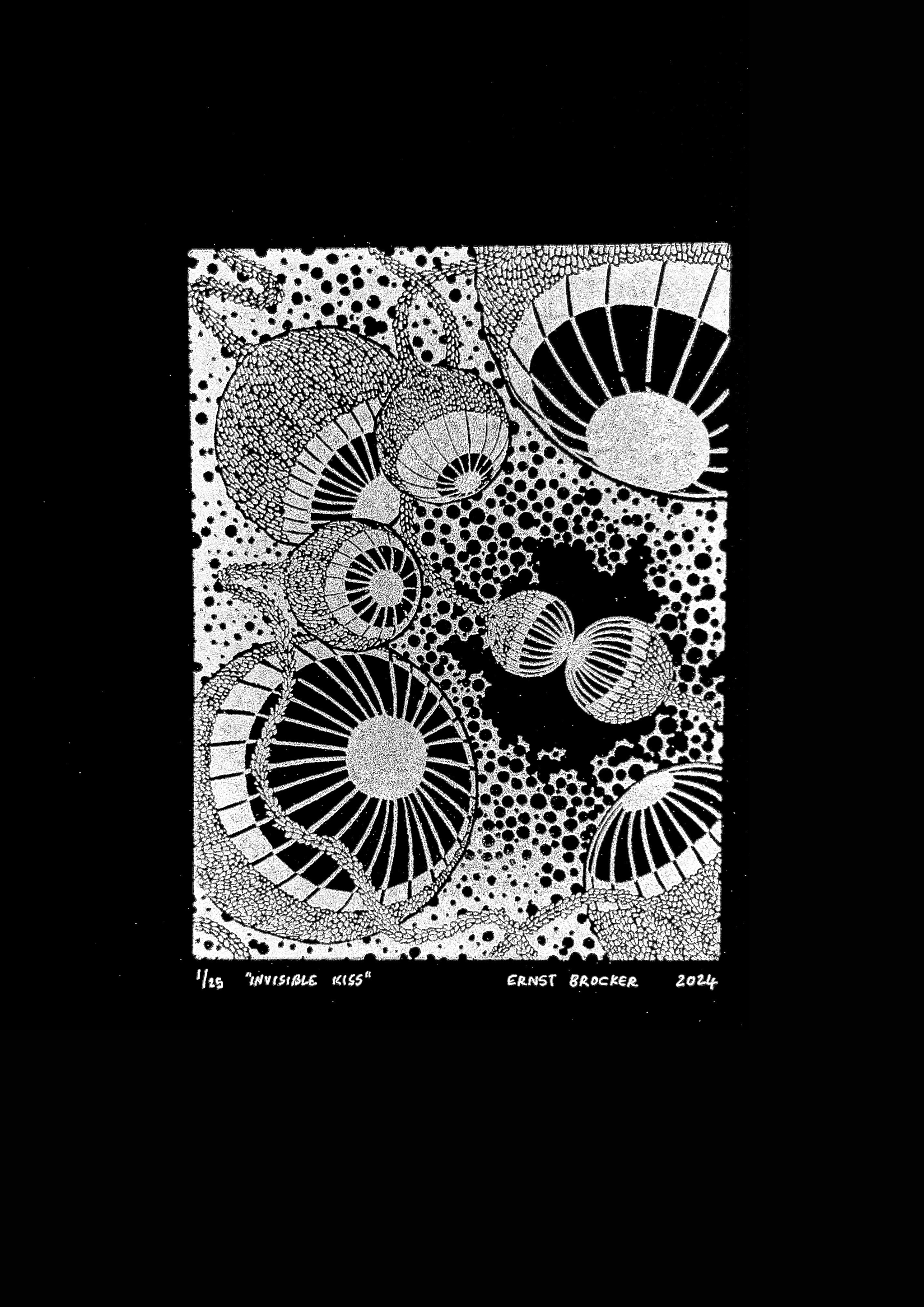 “Invisible Kiss” is an original signed lino etching printed by hand by the artist in Observatory, Cape Town.